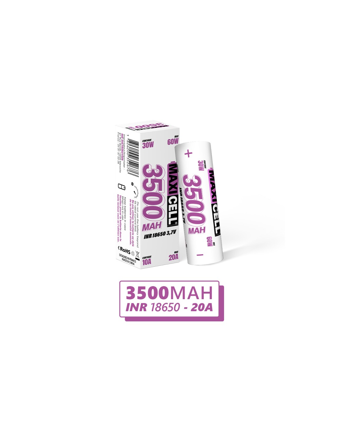 Cet accu 18650 spécialement conçu pour la vape de la marque MAXICELL possède une capacité de 3500 mAh, cet accu peut se vanter d'avoir un courant de décharge continu de 10 A et un courant de décharge maximum de 20 A .